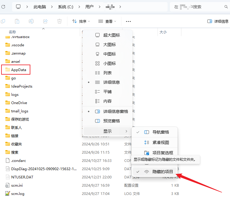 AppData文件是隐藏文件,点击 查看——显示——隐藏的项目 就可以看见隐藏文件