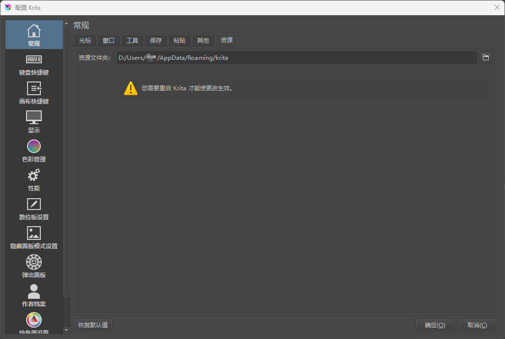- 修改资源路径 设置——配置 Krita——常规——资源 ,修改后记得重启 krita
