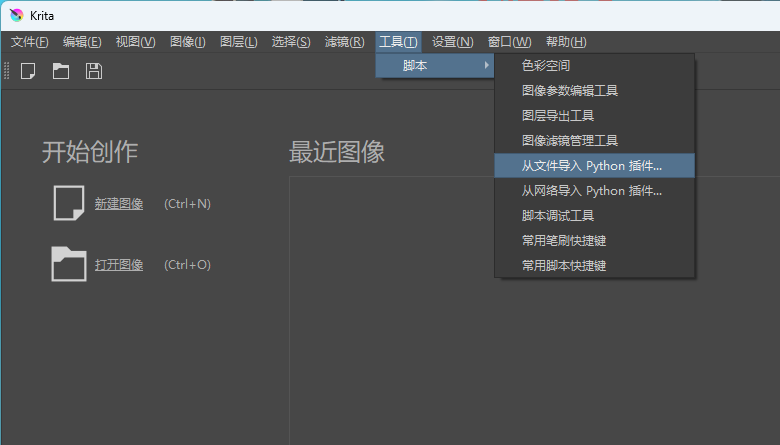 - Krita 安装成功后,点击上方任务栏,工具——脚本——从文件导入 Python 插件,导入下载的