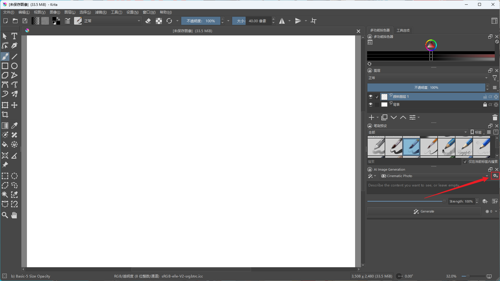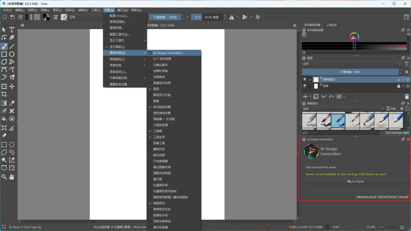 - 只有新建图像后才可以启用 AI 插件,设置——面板列表——AI Image Generation,启动成功后右下角会出现 AI Image