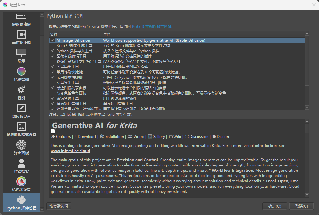 - 导入成功后,可以通过 设置——配置 Krita——Python 插件管理 中查看到