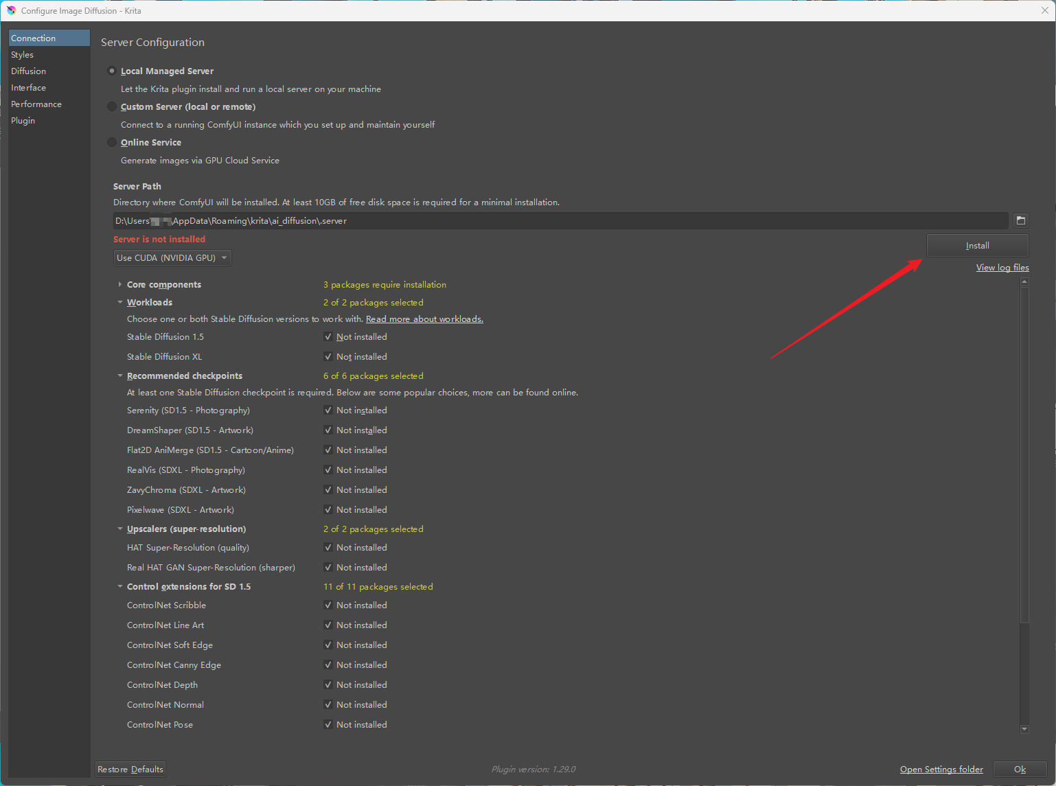 D:\Users\XXX\AppData\Roaming\krita\ai_diffusion\.server,勾选下面所有的选项,点击 Install 进行安装