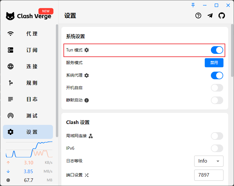 - 解决连接超时报错信息方法二:检测网络波动问题,有的时候虽然使用 ”魔法“ 网络连接没有问题,但是网络波动较大,导致连接超时下载失败,如果你使用的 Clash verge 这款工具,建议启动 设置——系统设置——Tun 模式 ,可以有效解决连接超时问题