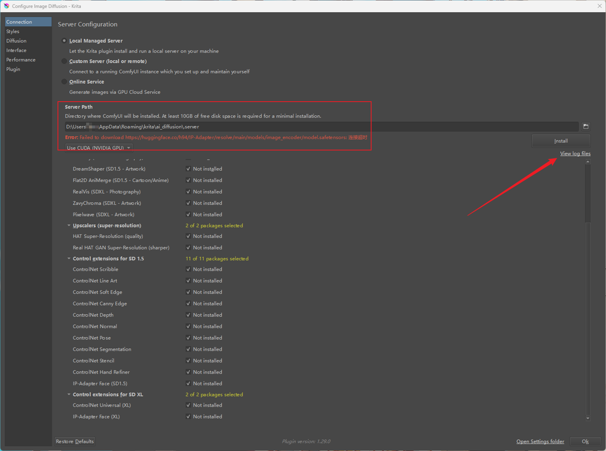 C:\Users\XXX\AppData\Roaming\krita\ai_diffusion\logs,可以通过查找日志信息找到下载链接和存放路径,我们需要一个一个的进行下载并保存到指定路径,这个方法只适用于极个别文件或者模型漏下的情况下,以下是我举得两个例子
