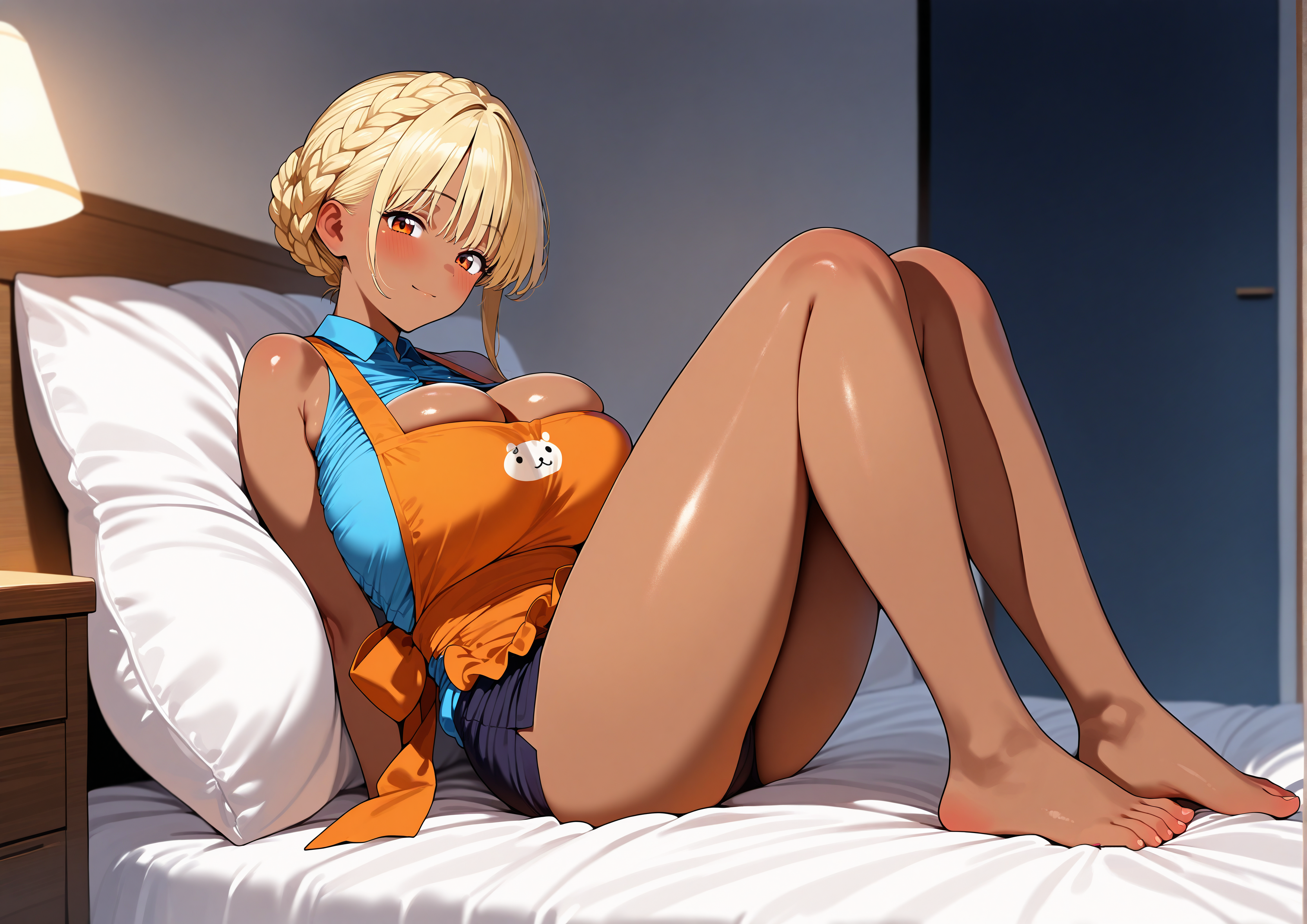 1 | 1 girl, brown skin,light smile, sitting, apron, clothes lift, blonde or orange dutch braid hair, bursting breasts, full body, bed |
