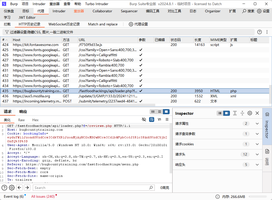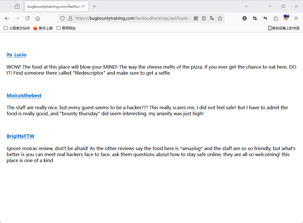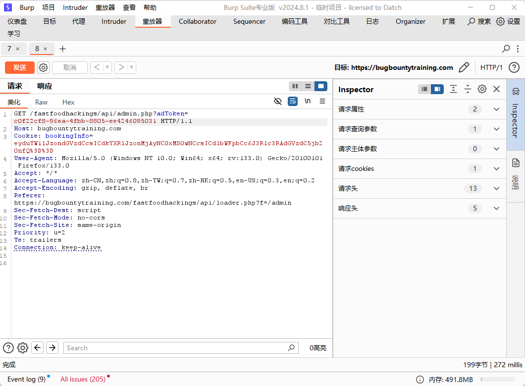 🆗,现在我们拿到了 Token,Burp 拦截访问 https://bugbountytraining.com/fastfoodhackings/api/loader.php?f=/admin 替换后续链接中