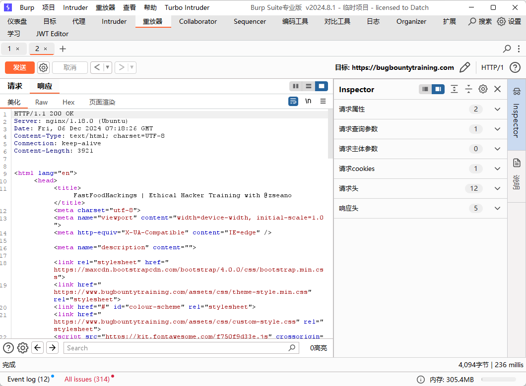 通过 Wappalyzer 插件可以知道网站操作系统是 Ubuntu 系统(Linux系统),通过前面的 Burp 响应包中也同样可以发现